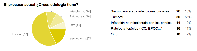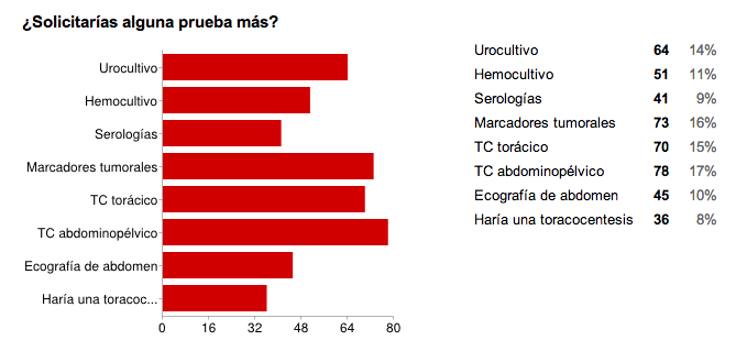 Para finalizar, vemos que más de la mitad de respuestas consideraban como primera posibilidad diagnóstica el que se tratase un cuadro tumoral, mientras que los procesos infecciosos quedaban relegados a un segundo plano